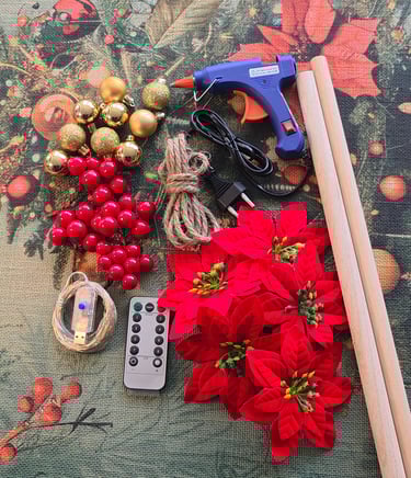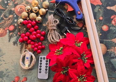Inside the tube: USB powered fairy-lights with remote, floral decorations, golden baubles, cheerful cherries, dowels, cord, a glue gun with sticks — all ready to bring your tree to life.