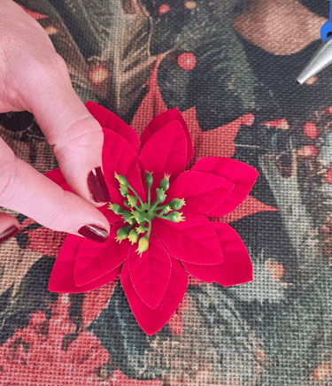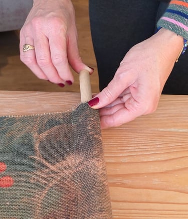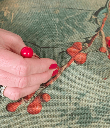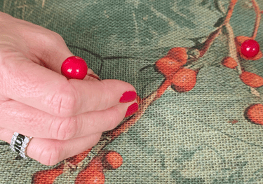 Gently push each cherry’s wire stem through the hessian backing and fold it over at the back to secure. A tiny detail with a big sparkle of cheer.